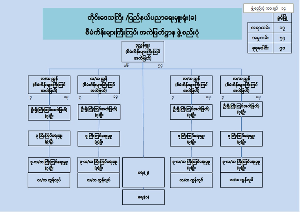 | ၁၁ | ဒေါ်ရီထိုင်သေး | ဉီးစီးအရာရှိ (စီမံကိန်းကြီးကြပ်အကဲဖြတ်) | B.Ed |