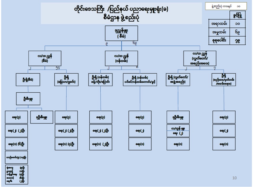 | ၁၀ | ဒေါ်မေသူစိုး | ဉီးစီးအရာရှိ (အစည်းအဝေးမှတ်တမ်း) | B.A,B.Ed |